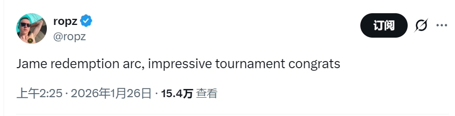 虎扑01月26日讯ropz于今日凌晨在社交媒体上公开祝贺Jame,称其在本届BLAST赏金赛中实现了“救赎之路”。ropz在推文中写道:Jameredemptionarc,impressivetournamentcongrats(Jame的救赎之旅,祝贺你献上了如此精彩的赛事)。