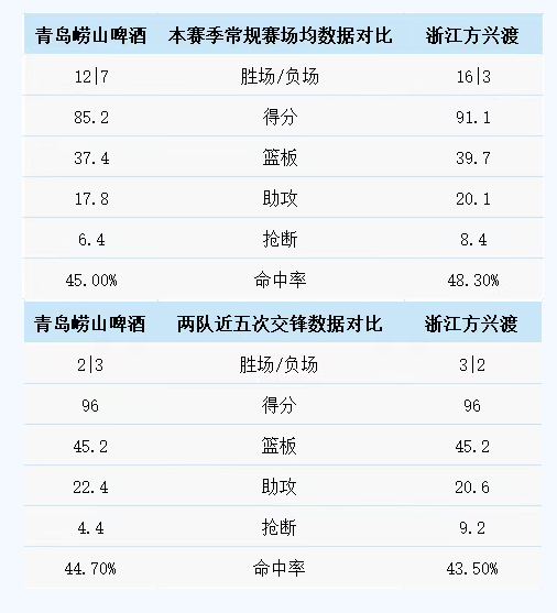 青岛崂山啤酒与浙江方兴渡历史上一共交手41次,青岛崂山啤酒11胜30负。上赛季两队交手7次,青岛崂山啤酒2胜5负。本赛季两队交手1次,青岛崂山啤酒0胜1负。