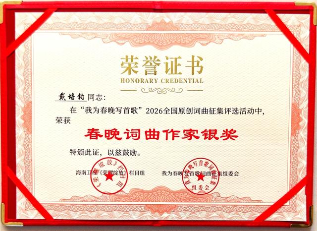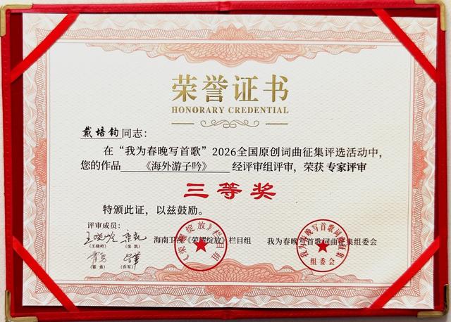 去年12月25日,我收到通知:歌曲入围了!27日,又传来进入复赛的消息。这下我坐不住了,天天守着官网刷新。29日晚,获奖名单公布,我在一长串名单里找到了《海外游子吟》。最终,这首歌获得了CCTV“我为春晚写首歌”2026全国原创词曲征集评选三等奖,而我也荣获“春晚词曲作家银奖”。
