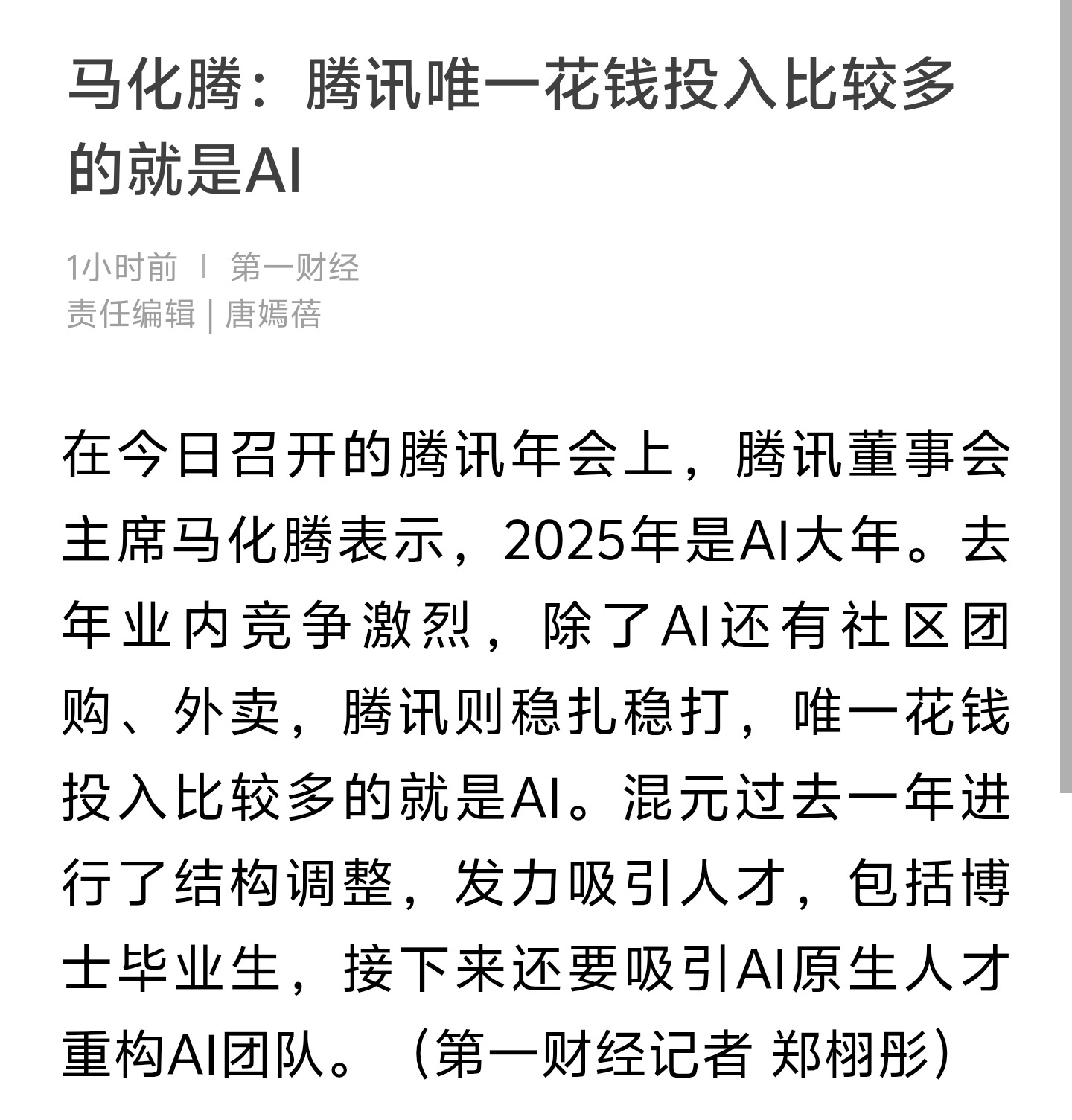 马化腾还说腾讯唯一花钱投入比较多的就是AI,所以以前做游戏真就没怎么花钱啊马化腾