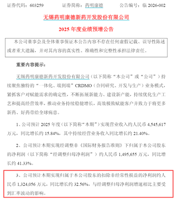 前不久,药明康德(603259.SH)发布2025年度业绩预增公告。