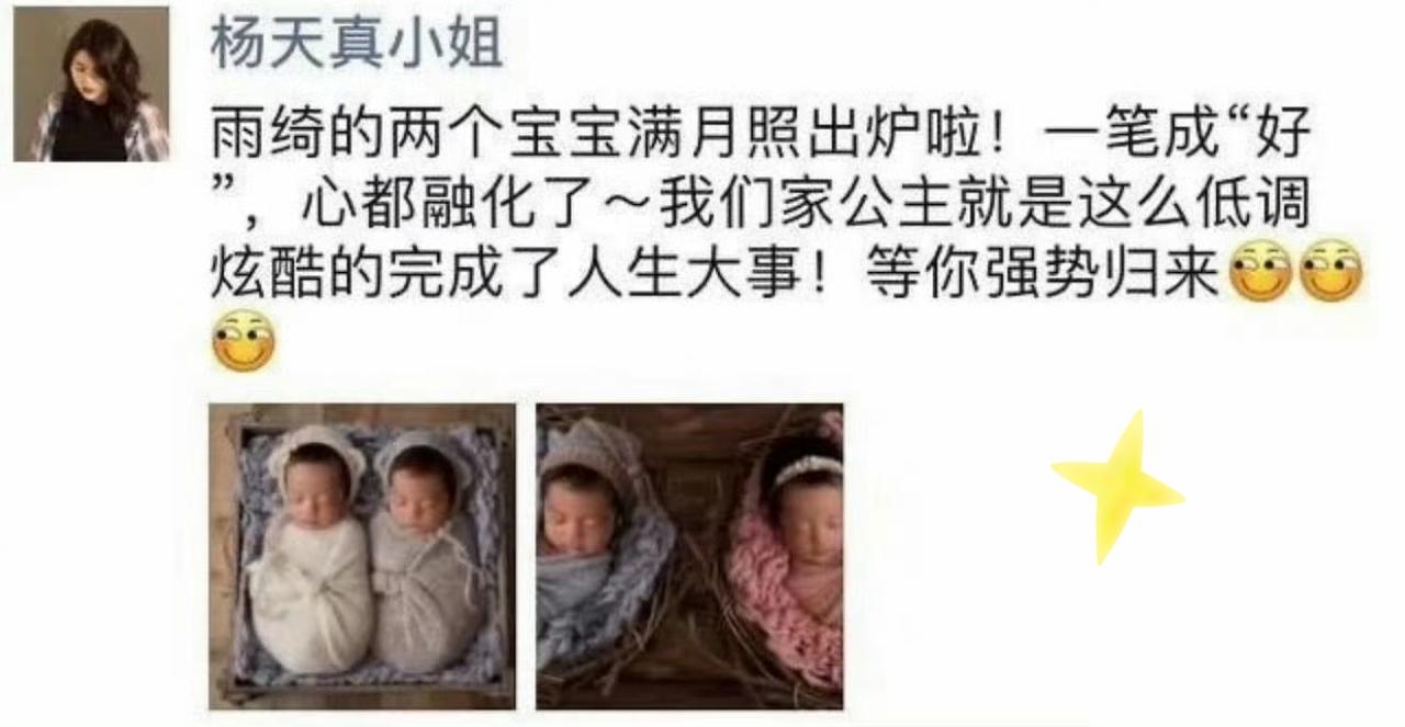 张雨绮的孕照是杨天真发的, 孩子的满月照还是杨天真发的, 再回头品品杨天真那句“