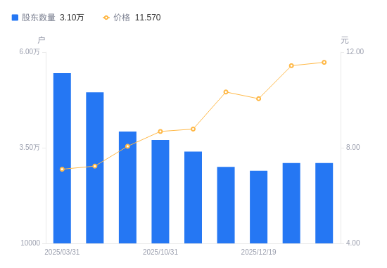 日期A股户数(户)流通A股户均持股数(股)户均持股市值(万元)2026-01-203100018435.2521.332026-01-093100018435.2521.072025-12-192900019706.6419.812025-12-103000019049.7619.682025-11-103400016904.0114.842025-10-313700015533.4213.482025-09-303921114052.1711.332025-06-304948110760.347.782025-03-31544939770.656.942024-12-31573909275.586.22