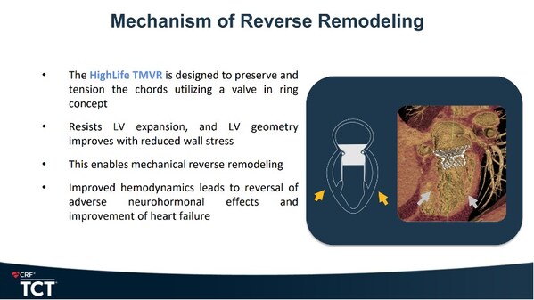 此外,根据2024TCTWolfgangRottbauer教授和ThomosE.Waggoner教授的报告,HighLifeTSMVR器械被证明有较好的"缩环效应",左室逆重构效果显著。由于其不依赖径向力支撑的锚定方式。同时血流动力学的改善可以降低心衰的发生,助力左心室逆重构,降低心衰风险,展现出独特的临床优势。