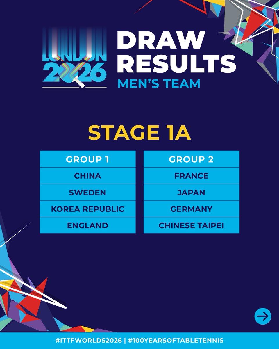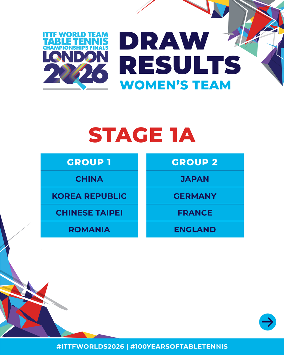 TableTennisEngland报道。第一阶段A组分组已确定,比赛将于5月2日在伦敦OVOArenaWembley开打。英格兰男队将在第一组对阵中国男队、瑞典男队和韩国男队,而英格兰女队将在第二组对阵日本女队、德国女队和法国女队。#ITTF#100YearsOfTableTennis#ITTFWorlds2026#London2026#TableTennis