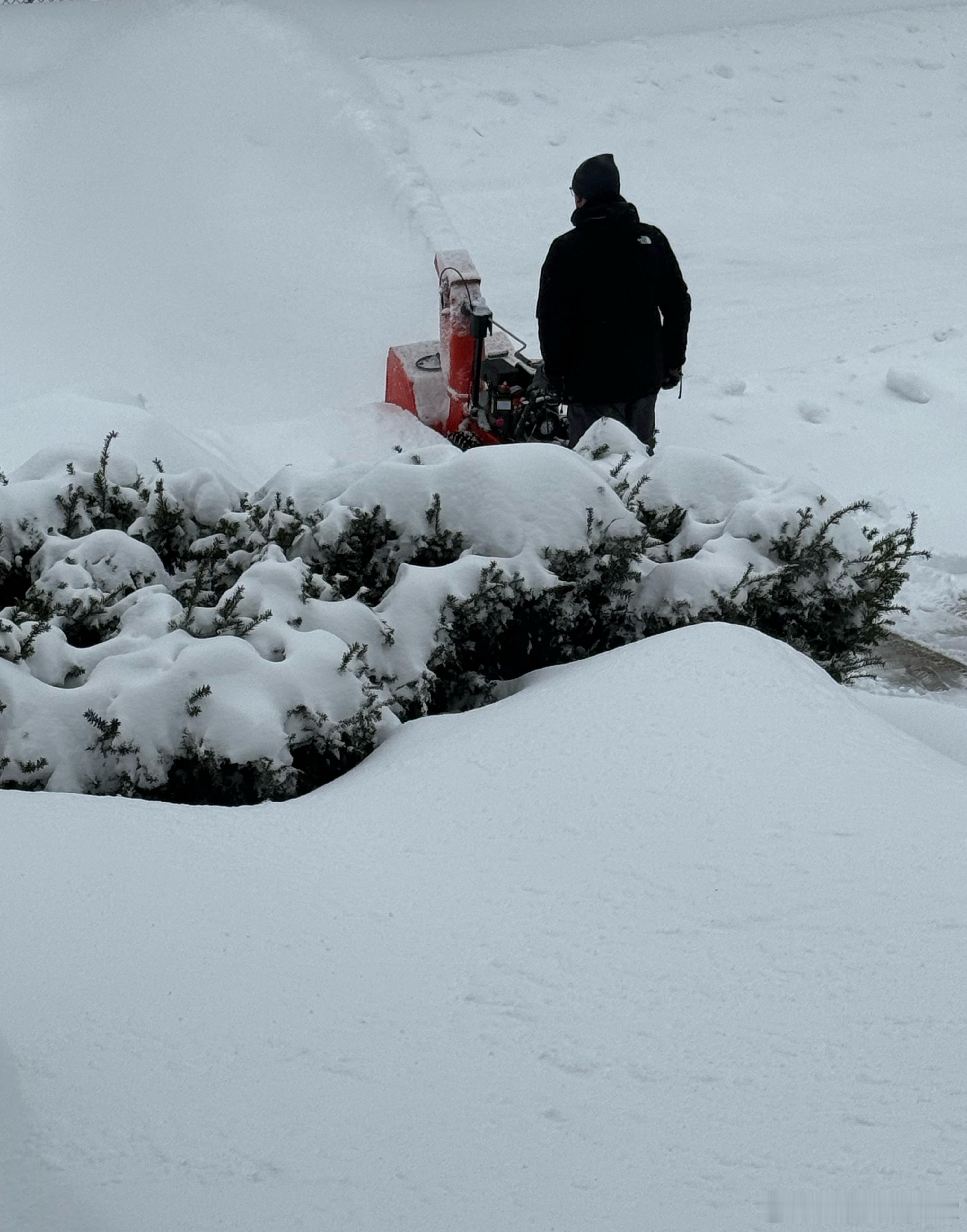 邻居们开始铲雪了,左邻手动铲雪,右邻用吹雪机,