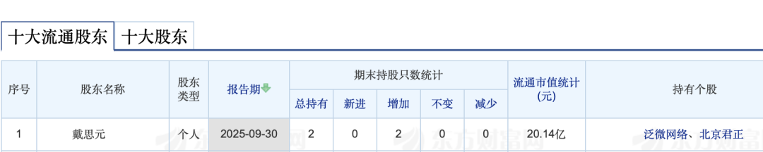 东方财富数据显示,戴思元曾持有指南针、上海电力、北京君正、泛微网络等多只股票。截至2025年9月30日,戴思元的持股市值超20亿元。