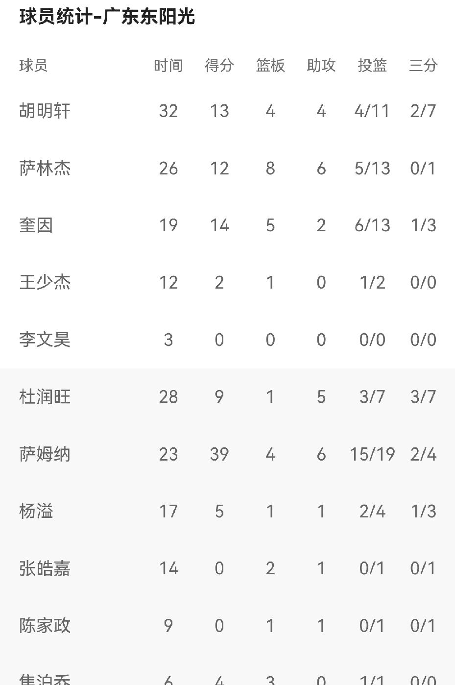 萨姆纳三节打卡,23分钟拿到39+4+6+2,高效的代表!可以说,前三节就靠萨姆纳独力扛着广东东阳光与天津先行者没有拉开差距,要知道,广东队前一节半三分8投0中,而天津队三分10投5中!三节战罢,广东74-73领先1分进入第四节,此前天津还曾领先过5分!在萨姆纳前三节扛住了天津队攻势后,第四节广东队其他球员终于梦醒,胡明轩连续命中三分,萨林杰也高举高打命中,杜润旺、杨溢也先后命中三分,广东队终于98-89战胜天津队,取得4连胜的同时,在积分上也首次超越浙江方兴渡,暂时排名第一!