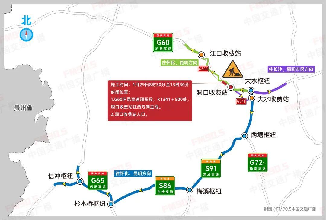 从洞口收费站下高速,绕行320国道,从江口收费站上沪昆高速往怀化、昆明方向通行。