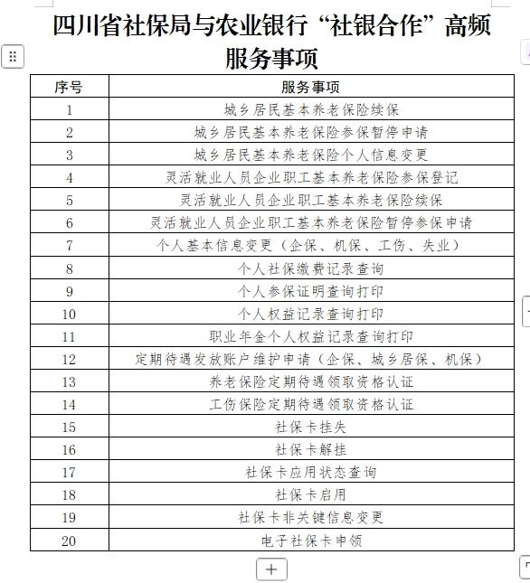 1月26日,记者从四川省人力资源和社会保障厅获悉,从今年1月起,四川省社保局携手中国农业银行四川省分行,通过全省1436个农业银行网点的3501台自助服务机,为群众提供养老保险待遇领取资格认证、个人社保缴费记录查询等20项高频服务事项。