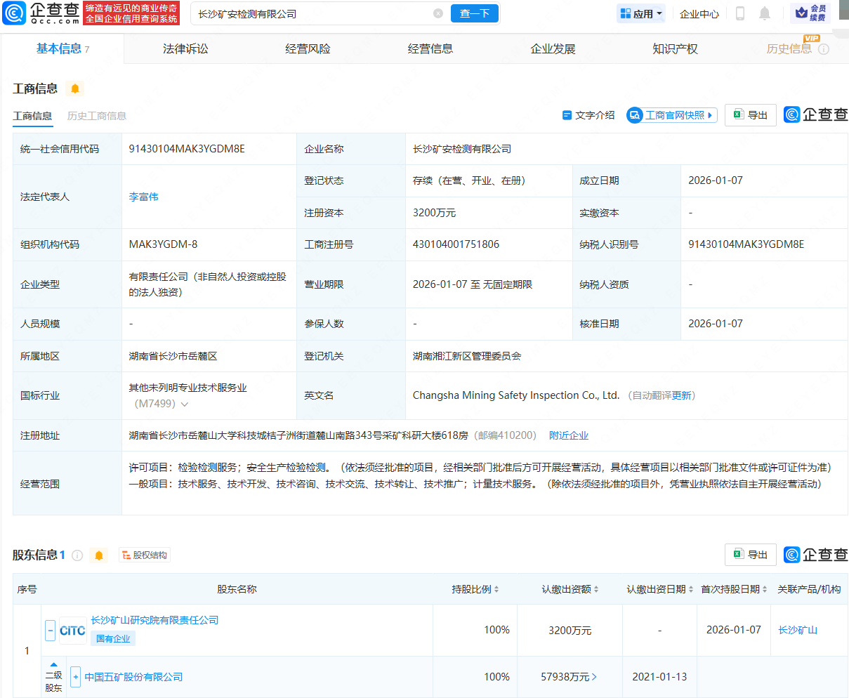 企查查APP显示,近日,长沙矿安检测有限公司成立,法定代表人为李富伟,注册资本为3200万元,经营范围包含:检验检测服务;安全生产检验检测;计量技术服务等。企查查股权穿透显示,该公司由中国五矿股份有限公司间接全资持股。