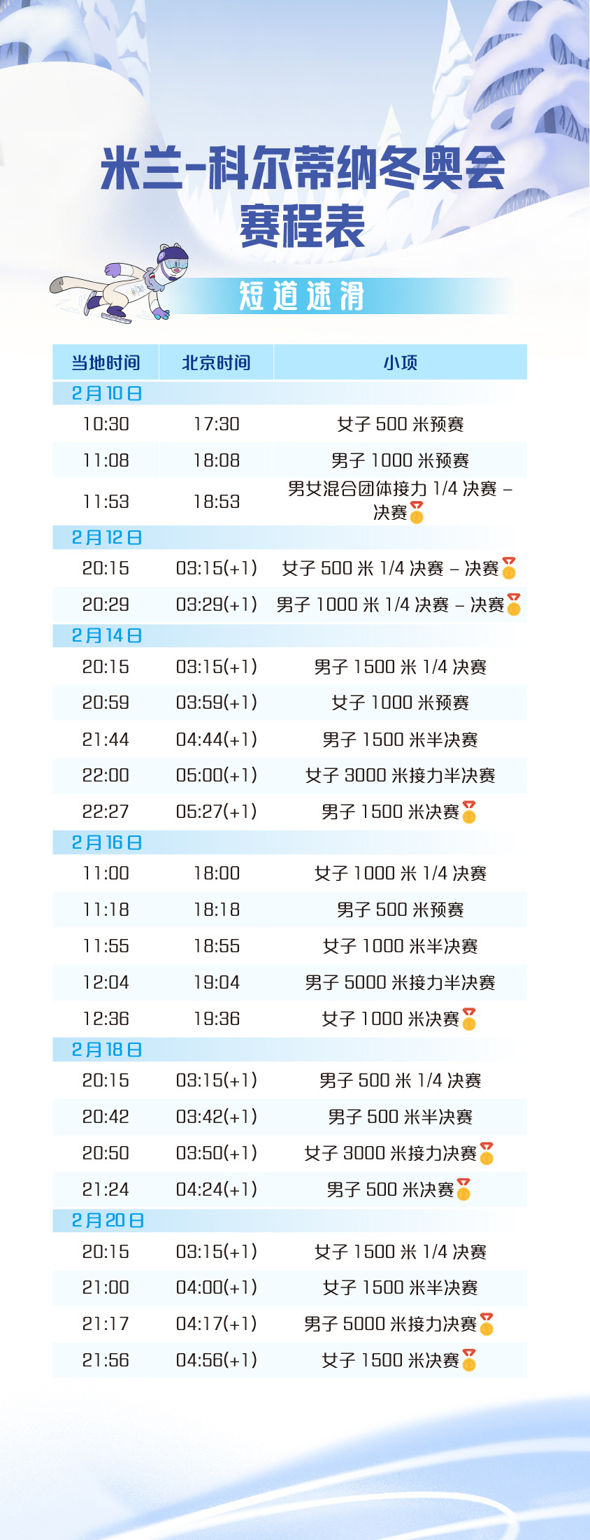 存一下米兰冬奥会主要想看的短道速滑、速度滑冰、冰壶赛程果然大部分的比赛时间都很阴
