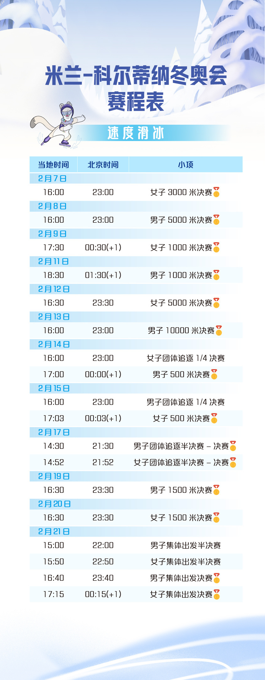 存一下米兰冬奥会主要想看的短道速滑、速度滑冰、冰壶赛程果然大部分的比赛时间都很阴间,是谁还没有准备好过米兰时间