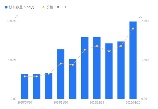 日期A股户数(户)流通A股户均持股数(股)户均持股市值(万元)2026-01-20995225054.219.152026-01-09738726809.149.312025-12-31715517030.028.612025-12-19795826320.598.612025-12-10796066318.688.022025-11-28514109784.188.612025-11-20638657876.067.182025-10-313367414937.499.742025-10-203183515800.379.162025-09-303200315717.439.13