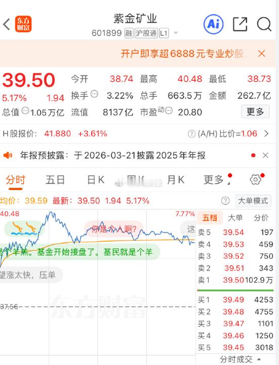 紫金矿业卖一挂单40.7亿元 又见无形的手,多只权重股尾盘现巨额压单 紫金矿业压单金额超40亿元 今天收盘集合竞价有些诡异紫金矿业卖一现超40.7亿元巨额压单中国平安卖一现超20.5亿元巨额压单江西铜业卖一现超19.3亿元巨额压单1月26日A股尾盘,紫金矿业卖一挂单达40.7亿元。这对散户而言,短期可能引发恐慌情绪,部分散户会因担心“主力出逃”而跟风抛售。但从长期看,这或许是监管层为抑制有色板块过热的调控手段,意在引导市场走向“慢牛”格局。部分权重股现大额压单A股