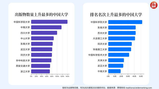 数据显示,浙江大学的出版物数量从2020年的23,510篇飙升至2025年的40,492篇,同比增长高达72%。但论增速浙大在国内高校只能排第十,中国科学院大学、中南大学、四川大学三所大学出版物数量增长都超过了100%。从排名上升的名次来看,中国科学院大学排名上升最多,从2020版的64名,上升至2025版的12名,上升了52名。东南大学和苏州大学这两所江苏的大学上升名次也很快,仅次于国科大,均上升了42名。