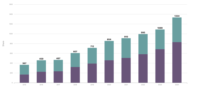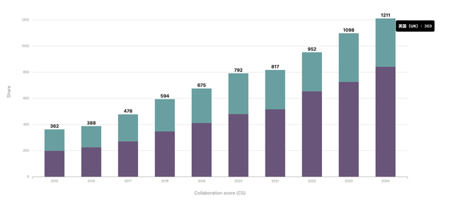 首先是在2020年后,中美合作份额近年来呈现下滑(即柱状图总高度)的趋势。在合作的出版物中,美国的份额占比正在持续下降,而中国则从2015年的46%左右,上升至2024年的61%。