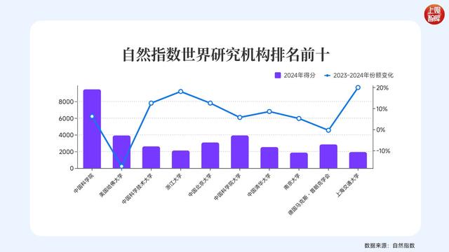 排名显示,在自然科学和健康科学领域,2024年中国研究机构(不单是大学)占据了世界前十的八席。中科院位于世界第一位,浙江大学位于第四,上海交通大学位于世界第十。而从国家来看,中国的数量和份额均是世界第一,超过了美国。自然指数数据显示,2023年到2024年,中国在自然研究领域研究份额上升了17.4%,而美国则下降了10.1%。