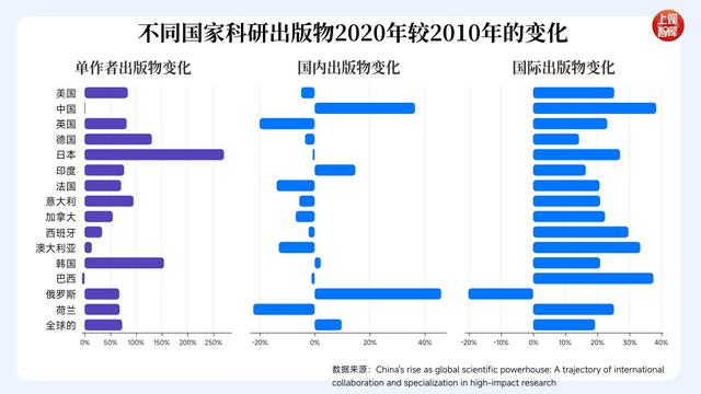 发表在《ResearchPolicy》期刊上的一篇文章研究了2010到2020年间世界各国的合作研究开放程度。研究发现,世界各国普遍呈现出国内出版物数量有所下降,而国际出版物数量有所上升的趋势。然而,中国的情况国内和国际合作情况均显著增长。中国的国内合作增长了37%,国际合作增长了38%,国际增长在所列出的国家中最好,显示出中国科研实力的双向增长。