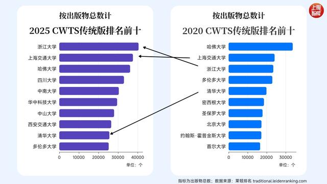 在莱顿2025传统版排名中,浙大以40,492篇的出版物数量高居榜首,紧随其后的是上海交通大学(37,612篇)和哈佛大学(36,163篇)。在该榜单前十名中,中国高校占据了惊人的八席,此外还包括四川大学、中南大学、华中科技大学、中山大学、西安交通大学和清华大学。