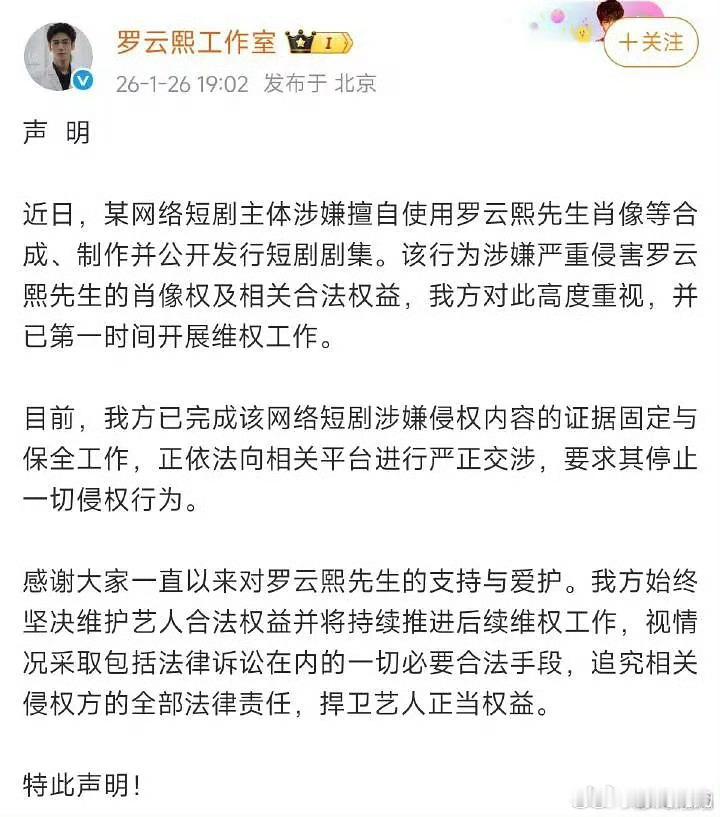 罗云熙工作室声明虽然最近ai漫剧很火,但直接用别人的脸属实是有点离谱了……