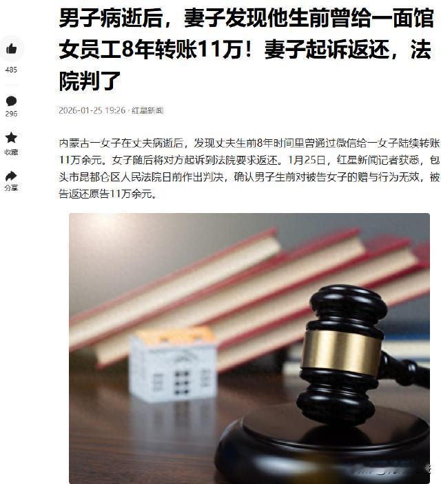 内蒙古,郭女士的丈夫突然离世,在整理丈夫遗物时,她翻看丈夫的手机时竟发现丈夫在8年的时间里频繁给一个叫郭某乙的人转账,全是几十、几百甚至几块的小额,累计达117362元。打听后得知郭某乙是连锁面馆女员工。郭女士找上门,郭某乙淡定解释,说钱是帮丈夫办储值、买礼盒和饭卡,自己没拿。郭女士觉得不对劲,8年11万,天天吃面也吃不了这么多,于是起诉了郭某乙。 据红星新闻报道,郭女士是内蒙人。 2025年4月,郭女士的丈夫突然离世! 在整理丈夫遗物的时候,郭女士心里满是酸涩。每一件物品都承载着他们曾经的回忆,让她忍不住一直在泪流。 当她拿起丈夫的手机,准备把一些重要的信息整理保存时,她整个人都懵了。 从2017年开始,丈夫竟然频繁地给一个叫郭某乙的人转账。那些转账记录密密麻麻地排列着,每一笔金额都不大,有的是几十块,有的是几百块,甚至还有几块的。 郭女士一条一条地仔细查看,她粗略地算了一下,这8年下来,累计转账金额竟然高达117362元。 郭女士立刻给郭某乙打电话,电话那头传来一个年轻女人的声音。郭女士问那些转账是怎么回事。郭某乙倒很淡定,说钱是帮丈夫办储值卡、买礼盒和饭卡用的,自己一分都没拿。 郭女士根本不信,8年时间转款11万多,就算天天去那家面馆吃山珍海味也花不了这么多。她决定找郭某乙当面问清楚。 第二天,郭女士来到那家连锁面馆,郭某乙看了一眼,还是那套说辞,说这些钱都是帮郭女士丈夫消费的,自己只是代收。 郭女士问,你帮我丈夫消费,有消费凭证呢? 郭某乙说时间太久,凭证都找不到了。 郭女士觉得郭某乙就是在狡辩,她想起自己和丈夫结婚这么多年,一直省吃俭用,为了这个家操碎了心。而丈夫却背着她在外面乱花钱,还把钱转给一个陌生女人。 回到家后,郭女士越想越不甘心。她决定起诉郭某乙,要回那些原本属于自己的钱。 这些钱到底该不该返还呢?这又涉及到哪些法律支撑呢? 从法律角度来看,这117362元属于郭女士和丈夫的夫妻共同财产。 根据民法典第一千零六十二条规定,夫妻在婚姻关系存续期间所得的工资、奖金、劳务报酬等财产,为夫妻的共同财产,归夫妻共同所有,夫妻对共同财产,有平等的处理权。 郭女士的丈夫在没有经过郭女士同意的情况下,擅自将这么多钱转给郭某乙,属于无权处分。因为夫妻共同财产是一个整体,任何一方在处理重大财产时,都应该征得另一方的同意。 而且,郭女士的丈夫在8年时间里频繁给郭某乙转账,这种行为违背了夫妻之间的忠实义务。 夫妻之间应该相互忠诚、相互尊重,而丈夫的这种行为显然是对妻子的不尊重,也给妻子造成了财产和精神上的双重伤害。 郭某乙称这些钱是帮丈夫办储值卡、买礼盒和饭卡用的,但是她并没有提供足够的证据来证明这一点。 根据民事诉讼法的规定,当事人对自己提出的主张,有责任提供证据。如果不能提供证据或者证据不足以证明其主张的,将承担不利的后果。 郭某乙无法提供充分的证据证明这些钱的用途,而郭女士却提供了转账记录等证据,证明丈夫给郭某乙转了钱。 最终,法院认定郭某乙的说法不成立,转账行为无效,判决郭某乙返还郭女士117362元。 对于这个结果,不同的人有不同的看法。 有人觉得郭女士做得对,夫妻共同财产就应该共同管理,丈夫擅自转钱给外人,就是对妻子的不尊重。郭女士通过法律途径维护自己的权益,是明智之举。 也有人认为郭某乙有点冤,她可能真的只是帮郭女士丈夫消费,只是没有保留好凭证。而且,郭女士丈夫作为成年人,应该对自己的行为负责,不能把责任都推到郭某乙身上。 从法律层面看,夫妻共同财产受法律保护,任何一方未经对方同意擅自处分重大财产,都属于违法行为。 在这个事件中,郭女士丈夫的行为明显违背了法律规定,法院的判决维护了郭女士的合法权益。 郭女士丈夫背着妻子给别的女人转钱,不仅伤害了妻子的感情,也违背了公序良俗。而郭某乙作为收款人,在明知对方有家庭的情况下,还接受这些转账,也有一定的道德瑕疵。 对此,大家都怎么看呢,一起讨论一下吧!