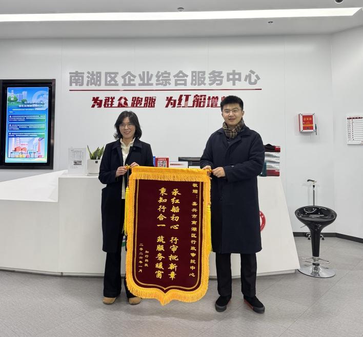 “张科长,这面旗,你们当之无愧!”来人是浙江艾摩星智能机器人有限公司负责人彭先生,他小心翼翼展开手中的锦旗,“承红船初心、行审批新章,秉行知合一、筑服务暖窗”20个金色大字,在大厅的灯光下熠熠生辉。