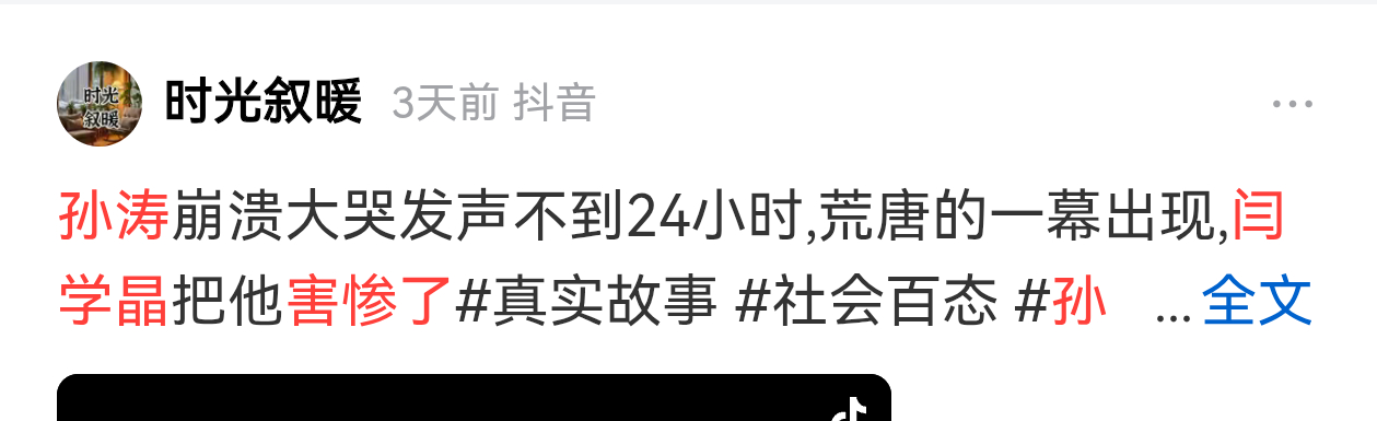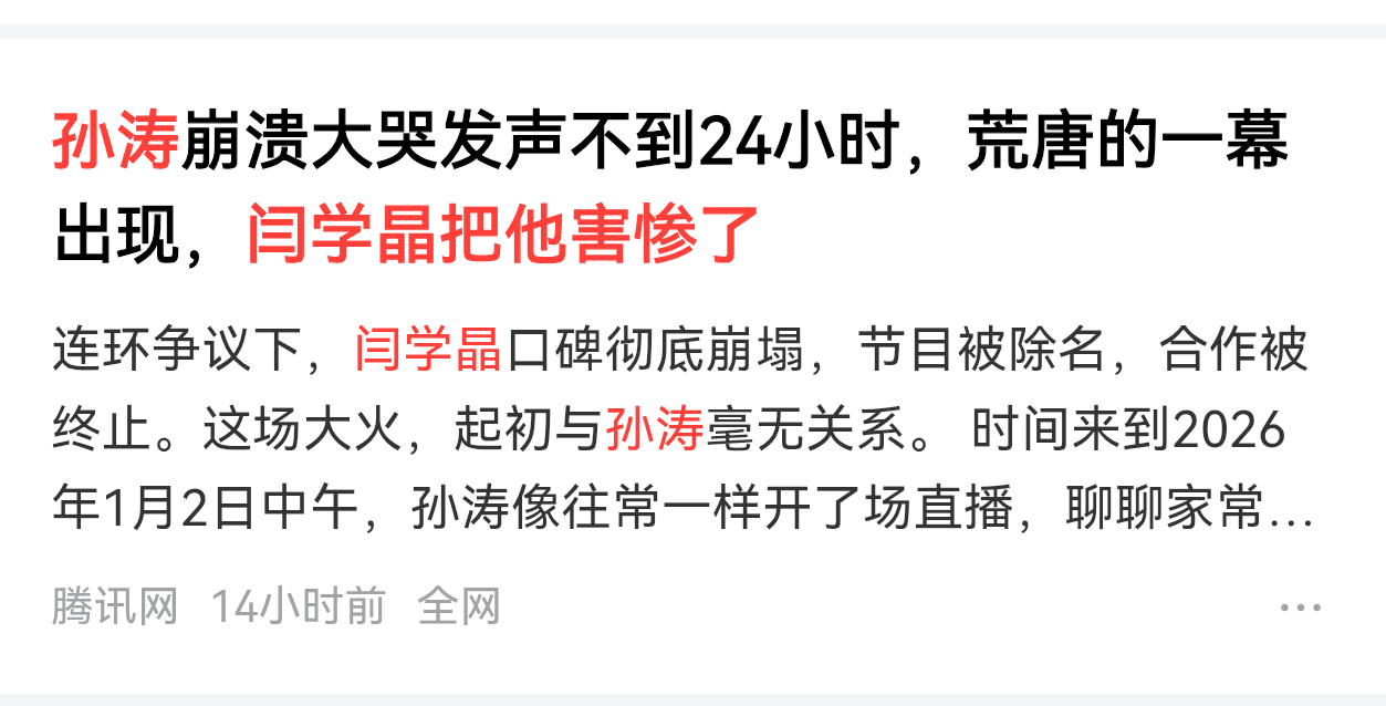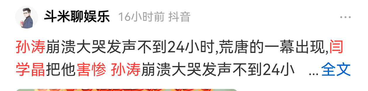 【闫学晶把孙涛害惨】又一轮嗜血的流量起来了。闫学晶害孙涛?她一没有主观意图,二没有客观行为,认为闫学晶害孙涛是丧良心判断。谁害的孙涛?是哪些嗜血流量的谣棍和不辨真假就激动的傻缺。