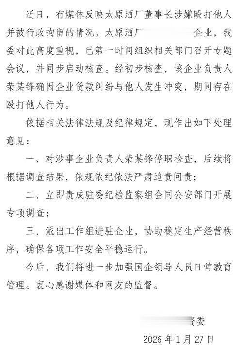 近日,有媒体反映太原酒厂董事长涉嫌殴打他人并被行政拘留的情况。太原酒厂系我委监管企业,我委对此高度重视,已第一时间组织相关部门召开专题会议,并同步启动核查。