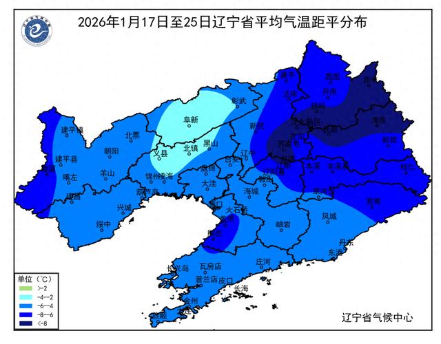 2026年1月17日至25日辽宁省平均气温距平分布(℃)。