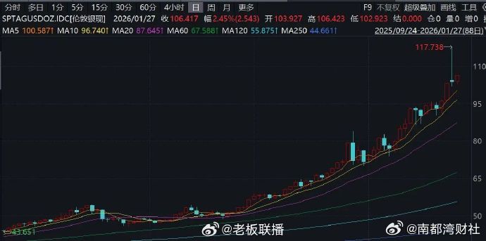 【#金价银价巨震#】受政治与财政风险上升推动,投资者转向避险资产。1月26日黄金价格一度大涨2.5%,创下每盎司5100美元以上的历史新高。现货白银日内涨幅一度高达14%,最高触及117美元/盎司。不过国际金银在冲高后大幅跳水,现货白银尾盘转跌,报约102.8美元/盎司。现货黄金向下跌破5000美元/盎司,收涨0.26%。1月27日亚洲早盘,国际黄金高开后拉升,白银震荡反弹,盘中涨逾2%。#黄金白银大回调# (老板联播)