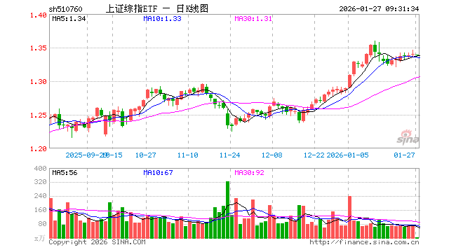 1月27日,上证综指ETF(510760)开盘跌0.07%,报1.339元。上证综指ETF(510760)重仓股方面,农业银行开盘涨0.58%,工商银行涨0.00%,中国石油涨0.00%,贵州茅台涨0.22%,招商银行涨0.11%,中国人寿涨0.15%,中国银行涨0.00%,中国平安涨0.27%,工业富联涨0.42%,紫金矿业涨1.85%。