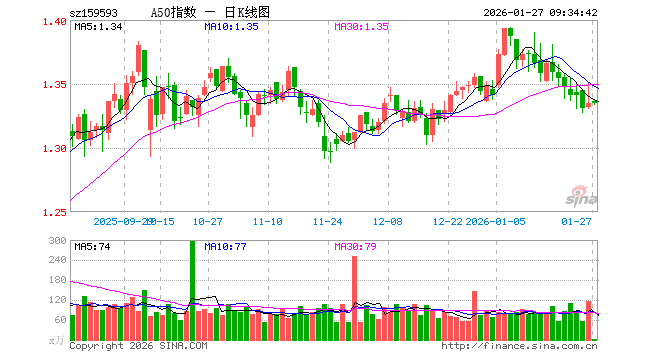 1月27日,中证A50指数ETF(159593)开盘涨0.07%,报1.336元。中证A50指数ETF(159593)重仓股方面,宁德时代开盘涨0.83%,贵州茅台涨0.22%,中国平安涨0.27%,中际旭创涨0.03%,紫金矿业涨1.85%,招商银行涨0.11%,美的集团涨0.07%,长江电力涨0.00%,立讯精密涨0.43%,中信证券涨0.07%。