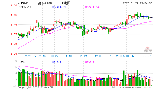 1月27日,A100ETF嘉实(159661)开盘跌0.14%,报1.436元。A100ETF嘉实(159661)重仓股方面,宁德时代开盘涨0.83%,贵州茅台涨0.22%,中国平安涨0.27%,中际旭创涨0.03%,紫金矿业涨1.85%,招商银行涨0.11%,美的集团涨0.07%,长江电力涨0.00%,东方财富跌0.13%,立讯精密涨0.43%。