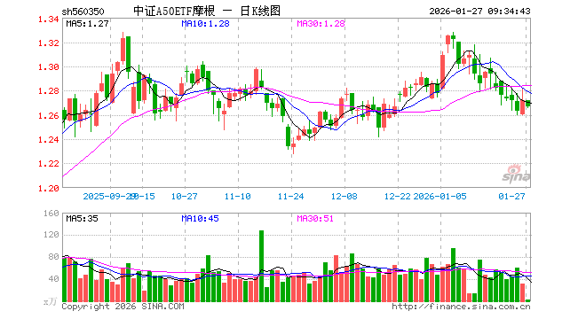 1月27日,中证A50ETF摩根(560350)开盘涨0.00%,报1.272元。中证A50ETF摩根(560350)重仓股方面,宁德时代开盘涨0.83%,贵州茅台涨0.22%,中国平安涨0.27%,中际旭创涨0.03%,紫金矿业涨1.85%,招商银行涨0.11%,美的集团涨0.07%,长江电力涨0.00%,立讯精密涨0.43%,中信证券涨0.07%。