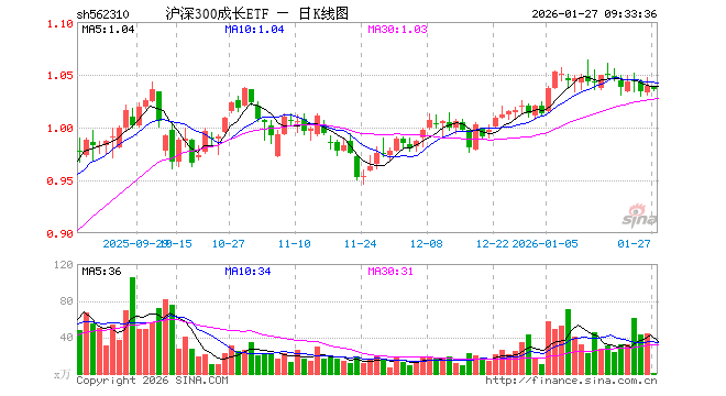 1月27日,沪深300成长ETF(562310)开盘跌0.10%,报1.038元。沪深300成长ETF(562310)重仓股方面,宁德时代开盘涨0.83%,贵州茅台涨0.22%,中际旭创涨0.03%,紫金矿业涨1.85%,新易盛跌0.28%,立讯精密涨0.43%,寒武纪涨0.00%,恒瑞医药涨0.40%,比亚迪涨0.04%,阳光电源涨0.21%。