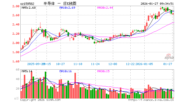 1月27日,半导体产业ETF(159582)开盘跌0.61%,报2.612元。半导体产业ETF(159582)重仓股方面,中微公司开盘涨0.22%,北方华创跌0.44%,寒武纪涨0.00%,中芯国际涨0.07%,海光信息涨0.50%,拓荆科技跌0.03%,长川科技跌0.55%,华海清科涨0.10%,中科飞测涨0.32%,南大光电跌0.42%。