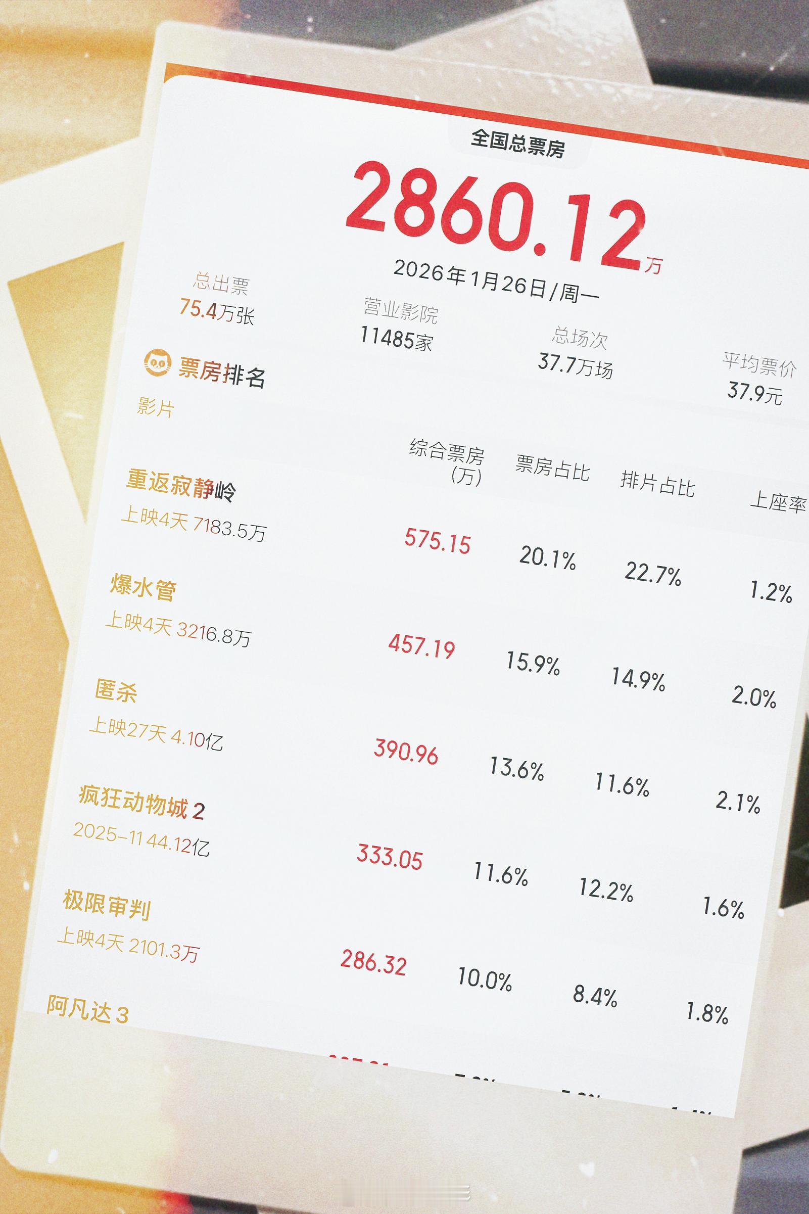 匿杀票房破4亿《匿杀》上映25天票房超4亿,票房占比13.6%、排片占比11.6%。晓明哥蔡民安演的惊艳,彭昱畅演的方天阳,角色塑造力强,他的表演进步太大了,柯汶利导演“杀”宇宙继续轰炸吧!今年跨年档的电影对院线大盘助力蛮大的,顺利过渡到2026。国产片加油!田宇院线播报