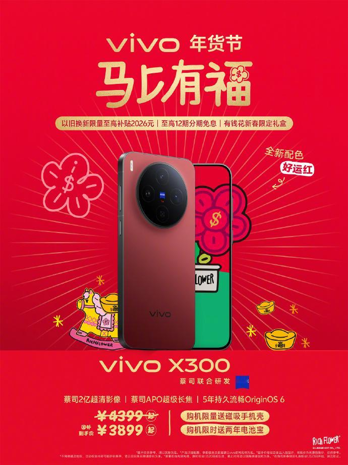vivo X300 好运红登场!新年新机,一整年的好运气🎊现在以旧换新最高补 2026 元,12 期免息,还有限定礼盒!3899 元起就能把红运新机带回家,新年握红机,整年都顺利!