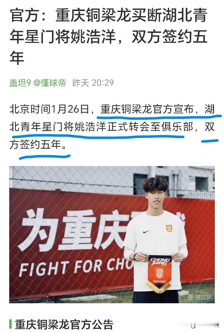 千万别再画大饼!别再吹捧炒作了!09足球小将的毛永彬,未来前景到底会怎样?放一个参照物!来看看19岁的姚浩洋的成长经历!时间会拆穿所有被过度吹捧炒作的网红球员,无一例外[吃瓜群众] 北京时间1月26日,19岁的大连籍门将姚浩洋,落笔签下一纸5年长约!正式官宣转会重庆铜梁龙足球俱乐部[加油] 这意味着,作为这一个转会冬窗,被多家中超俱乐部争抢的,转会市场上炙手可热的门将新星,姚浩洋终于花落重庆[击掌] 回头看看姚浩洋的成长经历,跟留洋没有一毛钱关系,跟互联网炒作没有一毛钱关系,就是在国内踏踏实实接受科学系统的训练,远离互联网纷扰,一步一个脚印的走过来[泣不成声] 姚浩洋出生于2006年10月28日,身高195cm,出自大连东北路小学,后进入大连星辉,再后来是湖北足协星辉青训学院[得意] 年少成名的姚浩洋,曾斩获二青会冠军及最佳球员等多项荣誉🏆 2023赛季,16岁的姚浩洋升入湖北青年星一线队,参加中乙联赛,完成职业生涯首秀,当赛季出场11次,11次首发,完成3次零封[加油] 2024赛季,17岁姚浩洋以租借方式加盟云南玉昆,登陆中甲赛场,赛季出战29场,首发28场,姚浩洋以稳定的发挥,帮助球队夺得中甲联赛冠军,冲超成功🏆 凭借整个赛季的优异表现,姚浩洋个人也斩获中甲赛季最佳守门员,并入选中甲年度最佳阵容[赞] 2025赛季,18岁的姚浩洋再度以租借方式加盟重庆铜梁龙,继续参加中甲联赛,赛季出战17场,首发17场,获得中甲联赛亚军,帮助球队冲超成功。这也是连续两个赛季,帮助两支中甲球队冲超成功[奋斗] 同样是在2025年,姚浩洋还代表了湖北男足,斩获全运会U20男足冠军🏆 在国家队层面,姚浩洋的履历同样亮眼,先后入选U16、U17、U20、U22等国字号球队[加油] 简单总结一下姚浩洋的经历,从大连东北路小学到大连星辉到湖北青辉,姚浩洋始终远离互联网纷扰,默默的接受正规科学系统的训练,其训练的刻苦程度,扎实的基本功,令所有带过他的门将教练为之欣慰[融化] 16岁初登中乙赛场[赞] 17岁登上中甲赛场,帮助云南玉昆冲超成功[赞] 18岁继续征战中甲,帮助重庆铜梁龙冲超成功[赞] 最终,凭借此前的优异表现,姚浩洋终于在19岁这一年,拿到一份人生中第一个五年长约,而且还是来自中超球队[大金牙] 圈内流传一个说法,哪支得到姚浩洋,未来十年球队在门将位置上将无忧,可见姚浩洋的实力是得到圈内广泛认可的[赞] 时至今日,姚浩洋在互联网上的流量,可能也比不了09足球小将的毛永彬,但姚浩洋就是在这样一个低调无纷扰的成长空间下,默默无闻踏踏实实走好每一步,当机会来临时,用优异的表现兑现了自己的天赋,19岁成为中超球队的门将,未来发展前景一片光明[奋斗]
