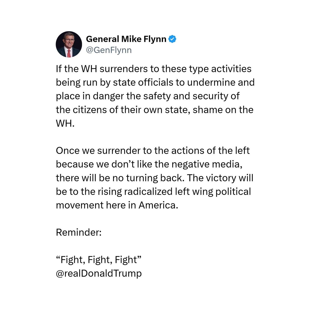 美国前陆军上将迈克·弗林Mike Flynn表示,“一旦我们因为不喜欢负面媒体而向左派的行动屈服,就再也没有回头路了。” “这场胜利将属于美国日益壮大的激进左翼政治运动。”