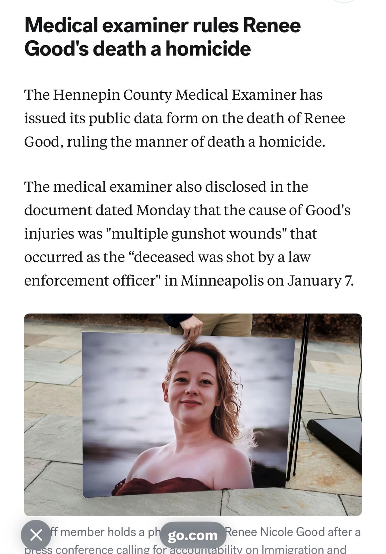 美国明尼苏达州亨内平县法医办公室已发布关于蕾妮·古德Renee Good死亡的公开数据表,裁定其死因是谋杀。