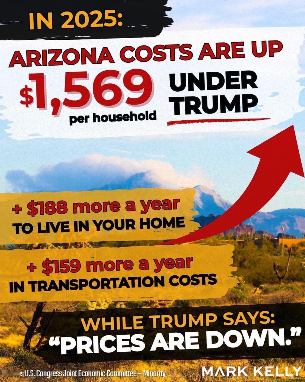 美国亚利桑那州国会参议员马克.凯利: “特朗普说“通货膨胀已经停止”,“物价已经降至down. ”,但亚利桑那州的家庭都知道这不是真的。 成本仍在上涨。人们不需要谎言,他们需要的是解决方案。”