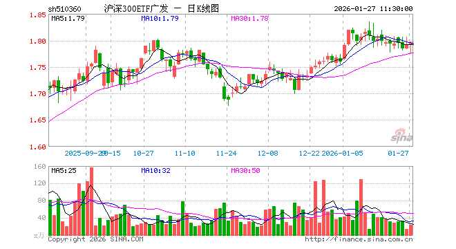 1月27日,截止午间收盘,沪深300ETF广发(510360)涨0.28%,报1.796元,成交额4061.30万元。沪深300ETF广发(510360)重仓股方面,宁德时代截止午盘跌0.89%,贵州茅台涨0.22%,中国平安涨3.07%,中际旭创涨5.61%,紫金矿业涨4.68%,招商银行涨1.10%,新易盛涨4.28%,美的集团涨0.73%,兴业银行涨1.01%,长江电力涨0.42%。