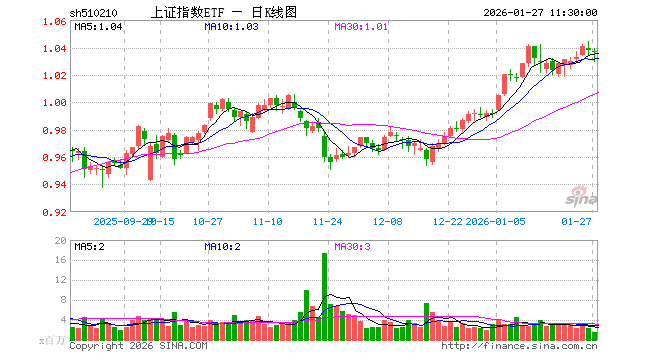 1月27日,截止午间收盘,上证指数ETF(510210)跌0.19%,报1.036元,成交额1.54亿元。上证指数ETF(510210)重仓股方面,农业银行截止午盘涨2.63%,中国石油涨1.54%,贵州茅台涨0.22%,工业富联涨2.97%,中国银行涨1.88%,紫金矿业涨4.68%,中国神华跌0.72%,中国人寿涨4.22%,招商银行涨1.10%,中国平安涨3.07%。