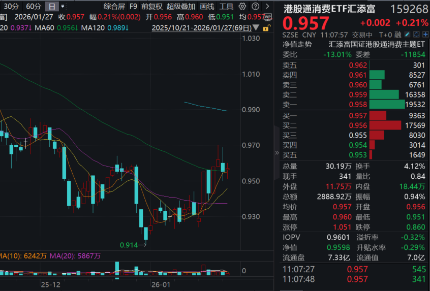 港股消费探底回升,港股通消费ETF汇添富(159268)涨0.21%,盘中成交额超3000万元!热门成分股中,安踏体育、李宁、周大福涨超1%,海底捞涨近1%;下跌方面,老铺黄金跌超4%,中国中免跌超3%,泡泡玛特微跌(成分股仅做展示,不作为个股推介)。