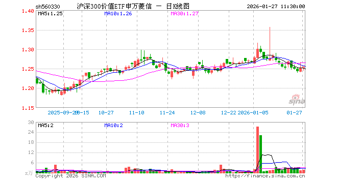 1月27日,截止午间收盘,沪深300价值ETF申万菱信(560330)涨0.32%,报1.255元,成交额225.08万元。沪深300价值ETF申万菱信(560330)重仓股方面,中国平安截止午盘涨3.07%,招商银行涨1.10%,美的集团涨0.73%,兴业银行涨1.01%,中信证券跌0.14%,工商银行涨1.38%,国泰海通跌0.85%,农业银行涨2.63%,交通银行涨1.20%,格力电器涨0.18%。