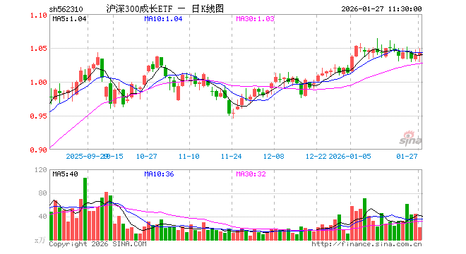 1月27日,截止午间收盘,沪深300成长ETF(562310)涨0.38%,报1.043元,成交额2200.21万元。沪深300成长ETF(562310)重仓股方面,宁德时代截止午盘跌0.89%,贵州茅台涨0.22%,中际旭创涨5.61%,紫金矿业涨4.68%,新易盛涨4.28%,立讯精密跌0.31%,寒武纪涨0.37%,恒瑞医药跌1.53%,比亚迪跌0.66%,阳光电源跌0.93%。