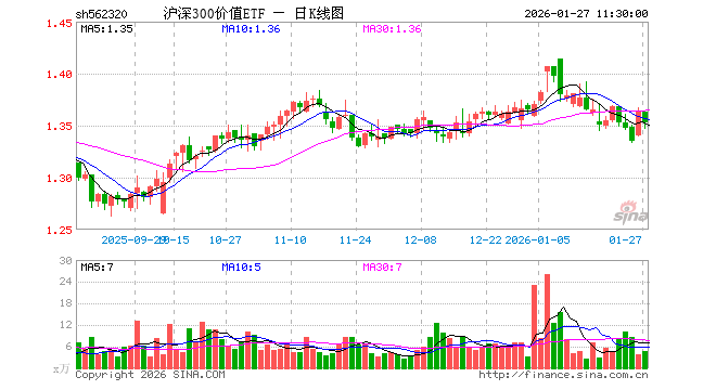 1月27日,截止午间收盘,沪深300价值ETF(562320)跌0.73%,报1.353元,成交额626.91万元。沪深300价值ETF(562320)重仓股方面,中国平安截止午盘涨3.07%,招商银行涨1.10%,美的集团涨0.73%,兴业银行涨1.01%,中信证券跌0.14%,工商银行涨1.38%,国泰海通跌0.85%,农业银行涨2.63%,交通银行涨1.20%,格力电器涨0.18%。