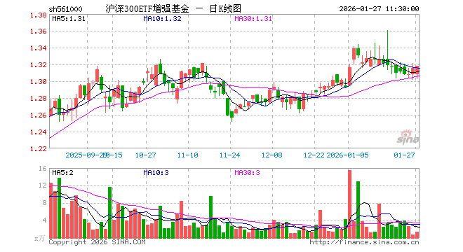 1月27日,截止午间收盘,沪深300ETF增强基金(561000)涨0.23%,报1.318元,成交额176.00万元。沪深300ETF增强基金(561000)重仓股方面,贵州茅台截止午盘涨0.22%,宁德时代跌0.89%,中国平安涨3.07%,美的集团涨0.73%,紫金矿业涨4.68%,立讯精密跌0.31%,招商银行涨1.10%,海光信息涨0.93%,中芯国际跌1.00%,东方财富跌1.63%。